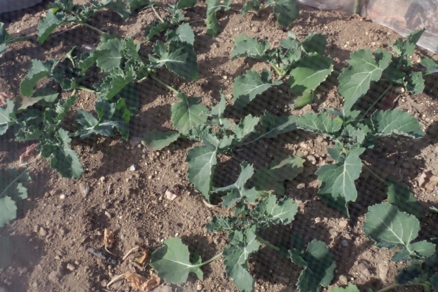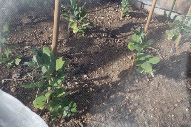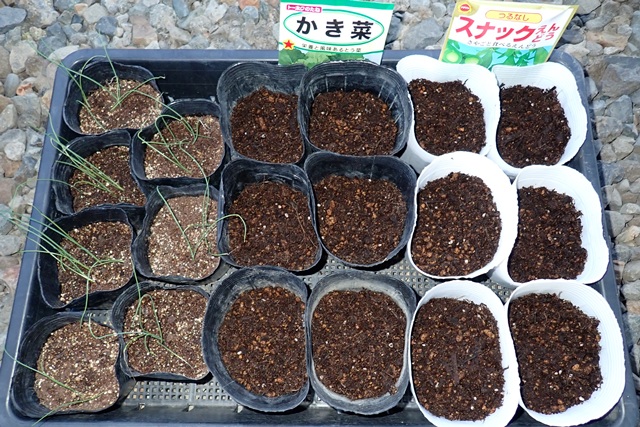 急いで、かき菜、スナックエンドウ、ネギの苗を地植えしました。